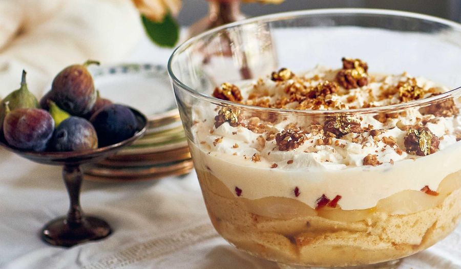 Leave to cool completely, then pour it over the soaked sponge and poached fruit. Cover the dish and refrigerate for at least 4 hours, or until completely set.